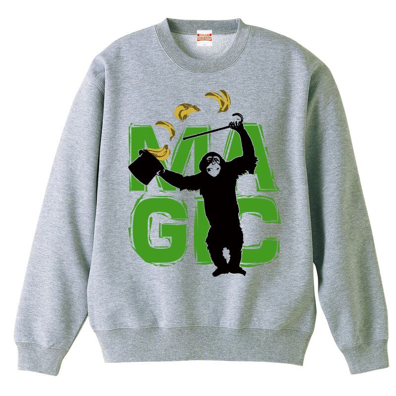 「MAGIC」の文字を背景に手品を披露するチンパンジーのカワイイデザイン